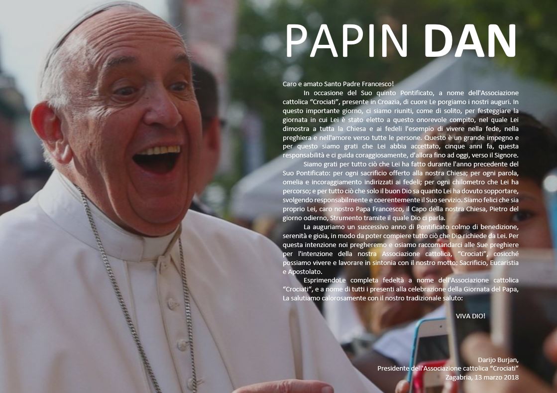 Želimo Vam od srca čestitati petu godinu Vašeg pontifikata u ime Križarske organizacije u Hrvatskoj. Tradicionalno smo se okupili na ovaj važan dan kako bismo obilježili dan kada ste izabrani na ovu, prije svega, časnu dužnost kojom cijeloj Crkvi i samim vjernicima dajete primjer životnog hoda u vjeri, molitvi i ljubavi prema svim ljudima. Velika je to odgovornost i upravo smo zato zahvalni na tome što ste ju prije pet godina prihvatili te hrabro od tada pa sve do danas vodite nas vjernike prema Gospodinu.
