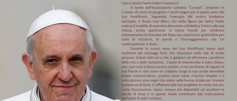 Sa svečane akademije prigodom proslave Papina dana, održane 13. ožujka 2017. godine u dvorani „Vijenac” Nadbiskupijskog pastoralnog instituta u Zagrebu, papi Franji je upućena brzojavna čestitka na hrvatskom i talijanskom jeziku u ime Križarske organizacije i svih okupljenih na svečanoj akademiji. Čestitku je na Akademiji pročitala tajnica Križarske organizacije, Ivana Bošković, te ju zatim uručila tajniku Apostolske nuncijature u Republici Hrvatskoj, mons. Januszu Stanislawu Błachowiaku. Nastavi čitati “Brzojavna čestitka papi Franji sa svečane akademije prigodom Papina dana 13. ožujka 2017.”