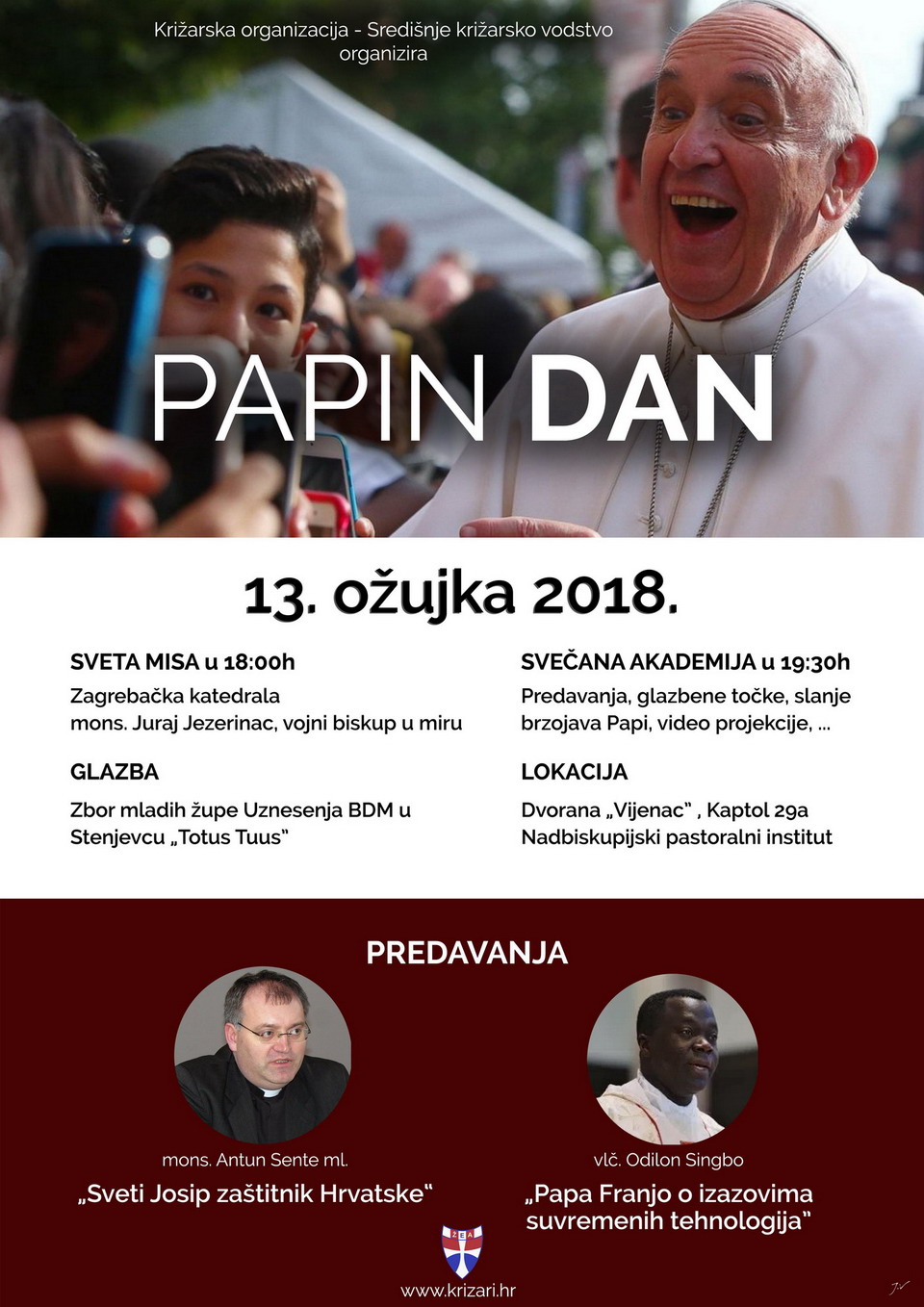 Drage sestre i braćo, pozivamo vas da nam u utorak 13. ožujka 2018. godine u 19:30 sati budete dragi gosti u dvorani „Vijenac“ u Zagrebu na proslavi Papina dana. Gosti predavači bit će mons. Antun Sente ml. i vlč. Odilon Singbo, a glazbenim izričajem ovu akademiju upotpunit će zbor mladih župe Uznesenja BDM u Stenjevcu „Totus Tuus“. Uoči akademije u 18 sati u zagrebačkoj katedrali mons. Juraj Jezerinac, vojni biskup u miru, će predslaviti misno slavlje na koje vas također pozivamo.